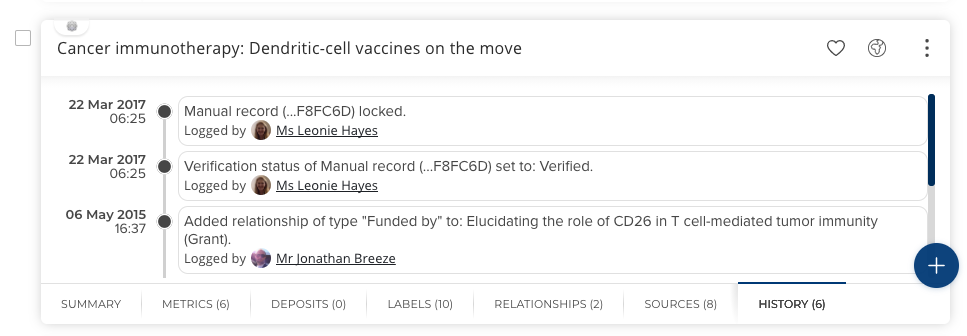 When you have the role of Research Manager (RI) and you impersonate an end user, your actions are recorded in the history of an item.