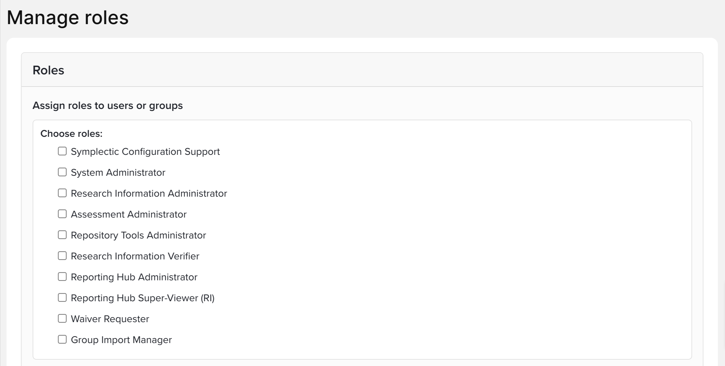 If both Repository Tools and Open Access Monitor are licenced, for a specific admin user to perform all repository, deposit, and OA configuration and management functions, they should be assigned both the Repository Tools Administrator and OA Monitor Administrator roles.