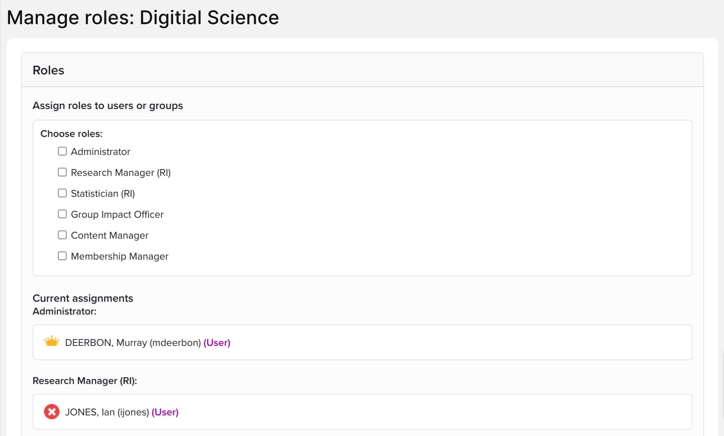 Tip: Group Administrators and Research Managers (RI) do not automatically acquire the Statistician (RI) role for their groups - it has to be explicitly given in addition to other roles.