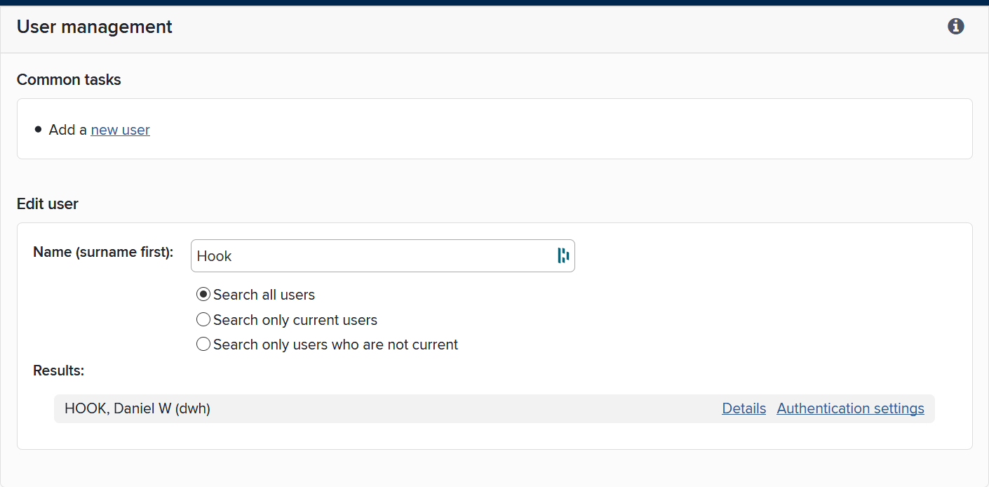 Tip: you can also switch a user whose details come from the automated feed to use an internally set password. To do this for an existing user, click on ‘authentication settings’ next to their name in the list of users and then change their authentication settings from ‘external’ to ‘internal’ and set a new password. This does not change them into ‘local users’ and will not change the way their other details are updated via the user feed.
