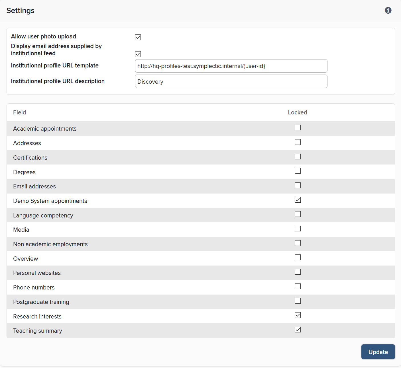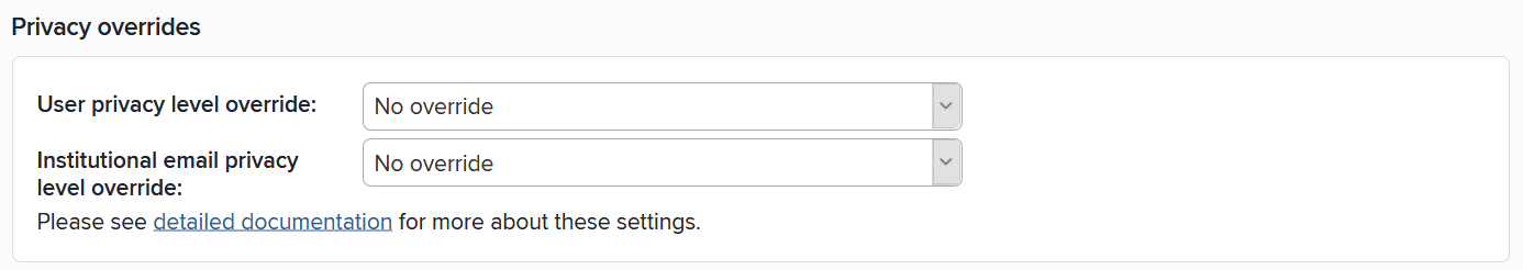 Institutional email privacy level override: Similarly to the override above, this option allows your institution to override the privacy behaviour for the user's institutional email address. Elements will never share the user's institutional email address publicly for a user whose overall profile privacy level is not also "Public", whatever the chosen value of this setting.