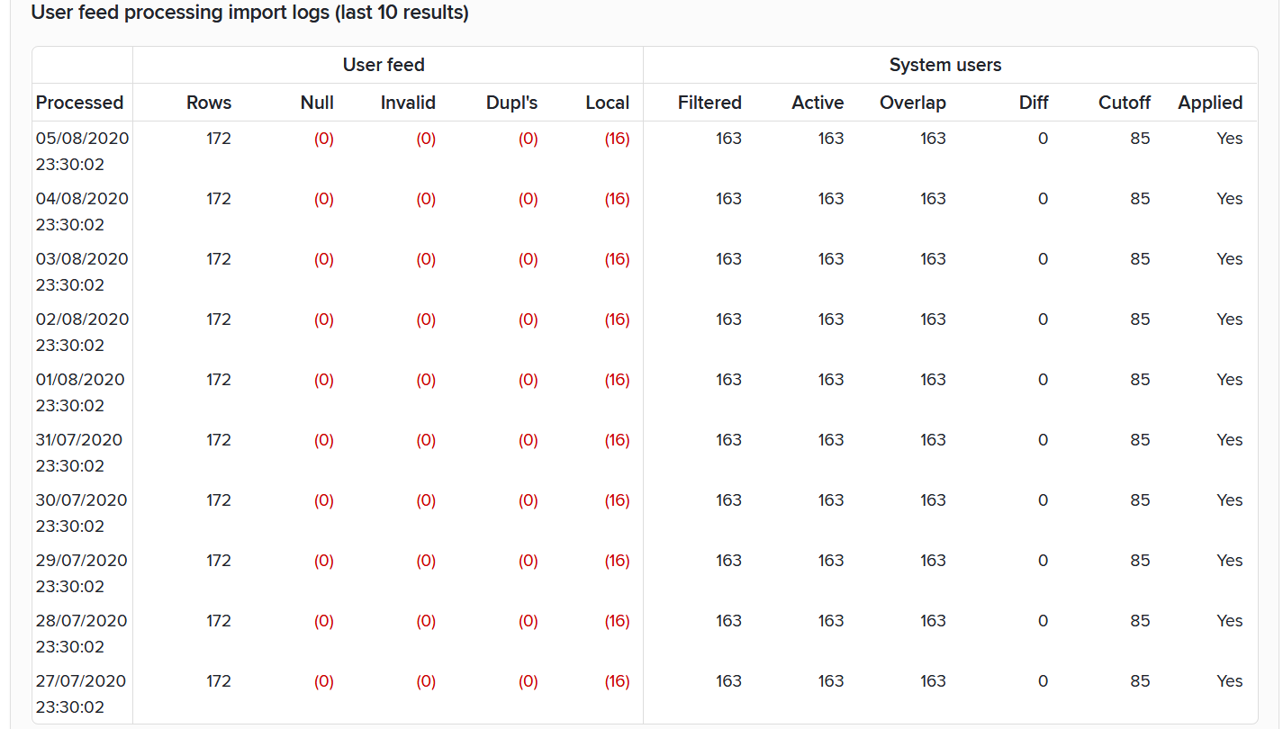 At the bottom of this section, a table summarises the results of the last 10 times the user feed was processed. It shows the number of rows that have been processed and filtered by the user feed, any errors that might have occurred and the number of active users present in the system after filtering against what was present previously.