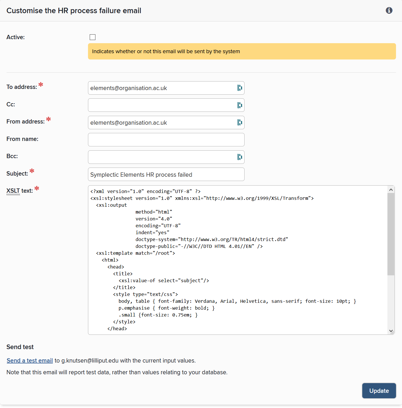 You can set up an automatic email that is sent whenever the process fails, and which also includes the reason for the failure. Activate this email using the check box at the top of this screen, then make any necessary changes to the settings for the email, including who it is sent to and who it appears to be from.