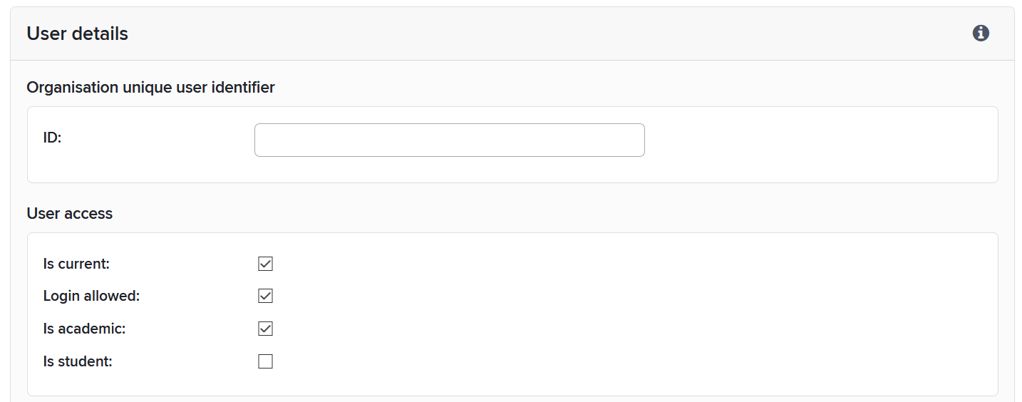 Note: this will mean that no further updates to these details will be obtained from the automated user feed. The user will have to be updated manually from now on. A more robust method for correcting a user’s details is to change the data in the HR feed, via your institution’s HR system.