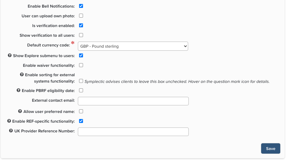 Enable sorting for external systems functionality | This enables the 'Update Sort for External Systems' section on the Account Settings page for each user. This been made optional, and Symplectic advises against using this functionality. |