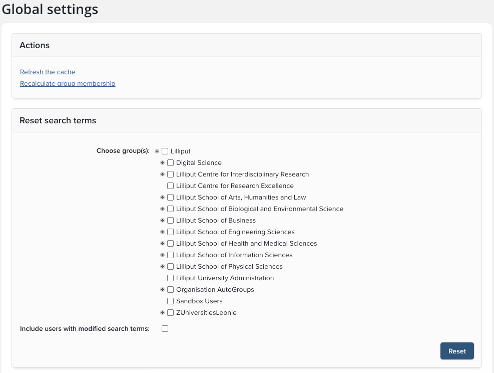 This section allows you to reset users' publication search terms to their defaults. These defaults are specified in the System admin > Data sources > Default search settings page or, if the "Override" setting on that page is disabled, on the equivalent page for the users' Primary Group(s).