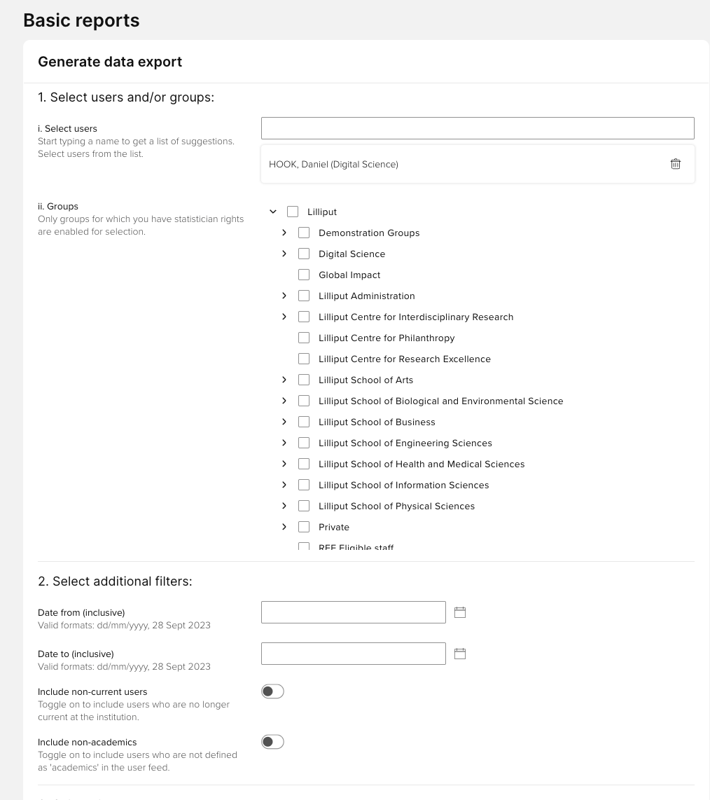 Next you can select the filters for the report. This will determine the data included in the report. You can also select whether to include non-current users (who have left your institution) or non-academic staff in the statistics. By default, both these groups will be excluded. Finally, you should choose which citation source to use as a base for your statistics.