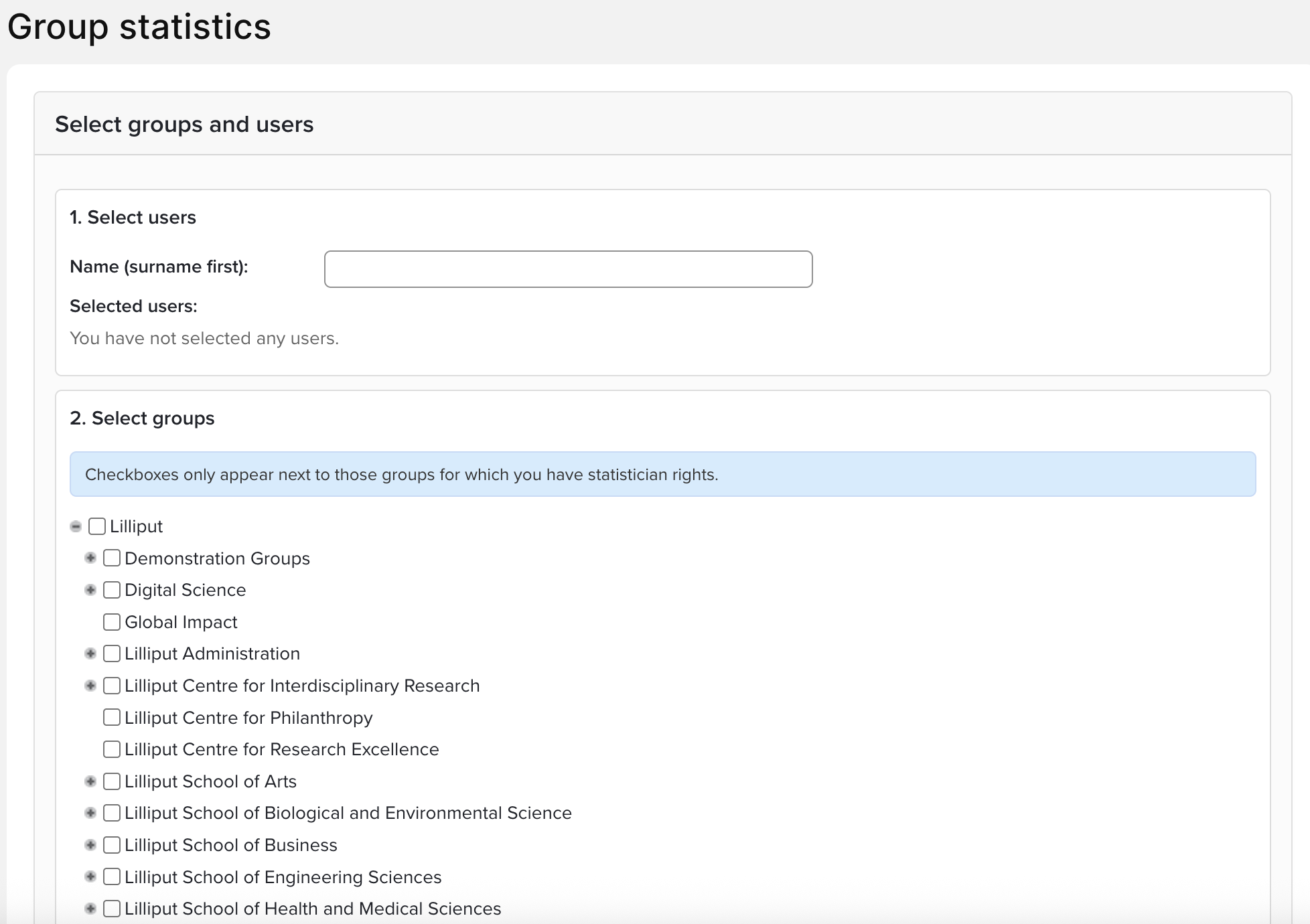 You can either build up a bespoke group of users by entering their names into the search box and adding them one-by-one to a list, or select existing groups in your organisation. To select existing groups, expand the organisation tree and check the relevant boxes. Only groups for which you have 'Statistician' access will have check-boxes. Similarly, only users within your groups will be available via the individual user search.