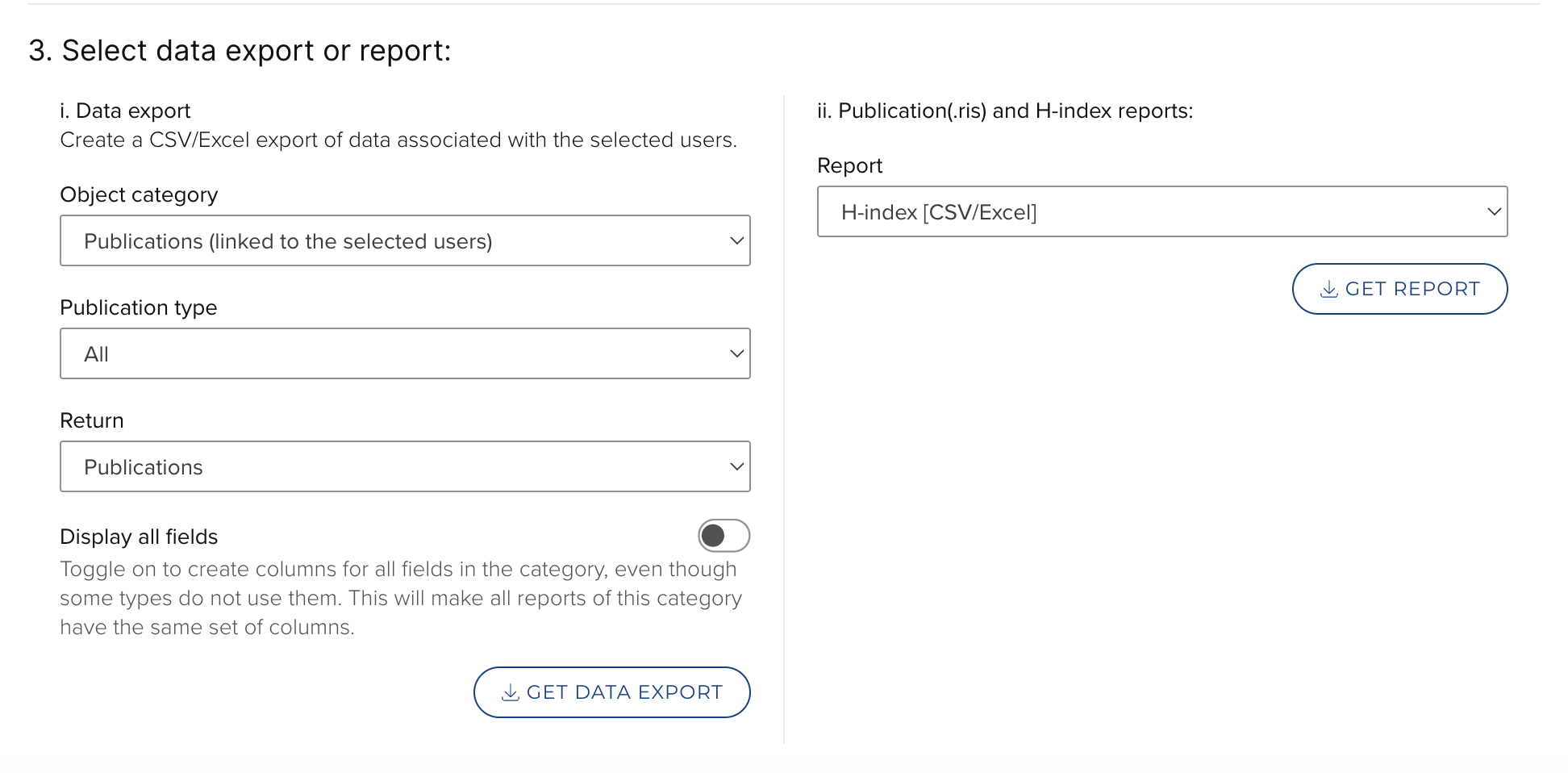 There are two main types of report: Data extract and Users and usage reports (this type also includes a summary publications report). All reports are created in CSV format and you will have the option to open or save the file. Downloads may hit server configured timeouts if you select a very large data set.