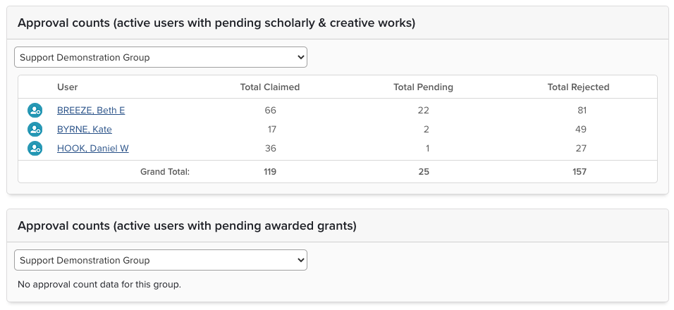 This table lists users by group and displays their individual approval, pending and declined counts. The number of pending, claimed and declined items associated (via any link type) with the implicit users of the selected group for every user who has at least one publication sat in pending. Any users who have only declined or only claimed pubs will not show up in the list or in the totalised numbers. The logic being that the section is designed to aid admins in identifying people who either need help or are not engaging. The Awarded Grants table will only show if you have the Dimensions Grant data source enabled.