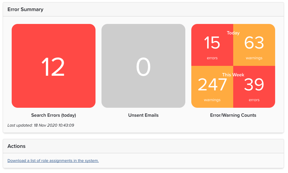Error/Warning Counts: the number of system errors and warnings that have been logged by the system for the current day and week