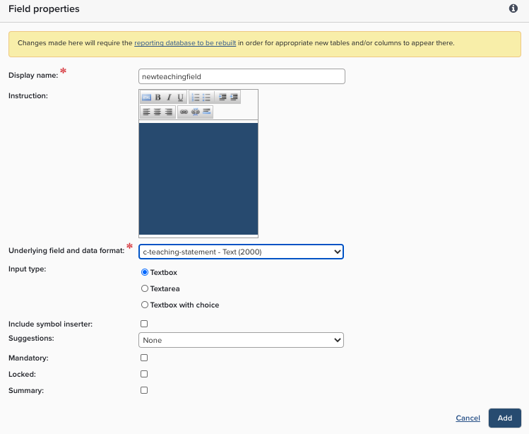 Choose a name for the underlying field. Custom types all begin with c- the display name for the underlying field is set via "Teaching Activity Types" and may be different for each type, depending on how the field is used (this is explained in more detail below).