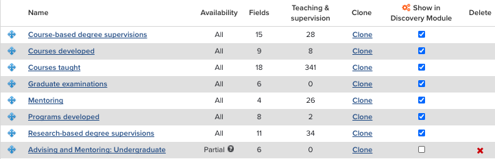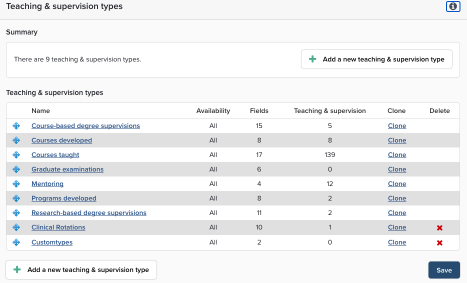 Select which date field(s) will be used to set and determine priority for Reporting date. For some types, such as Courses Taught, you may want to configure two reporting dates, a start and end date. Activity types that are not bounded in time should have only one Reporting date.