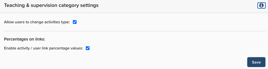 With this checkbox you can set whether users are allowed enter percentage values on their relationship with a Teaching Activity. For example, two users who co-taught a course may wish to each set their links to 50%.