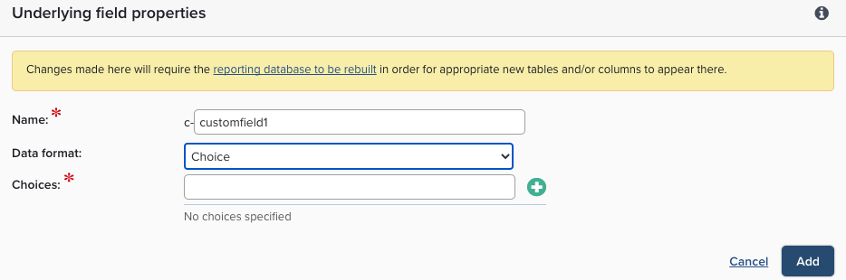 Underlying field and data format: select the underlying field that the new field will be based on. All underlying fields not already used by the type will be available here.