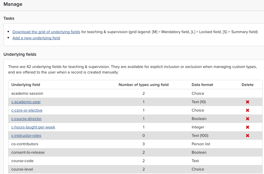 Navigate to System admin > Data category settings > Teaching activities > Underlying fields to view the current list of underlying fields for Teaching Activities. You can also download a grid (i.e. a table in CSV format) which details the underlying fields, their data formats, and how they are used in each different type of Teaching Activity object.