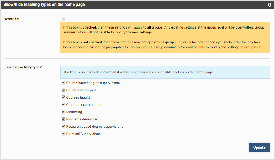Check the 'Override' box if you wish these settings to be enforced across the whole system. When you select 'Update', these settings will permanently overwrite any settings made at the Primary Group level, thus affecting all users.