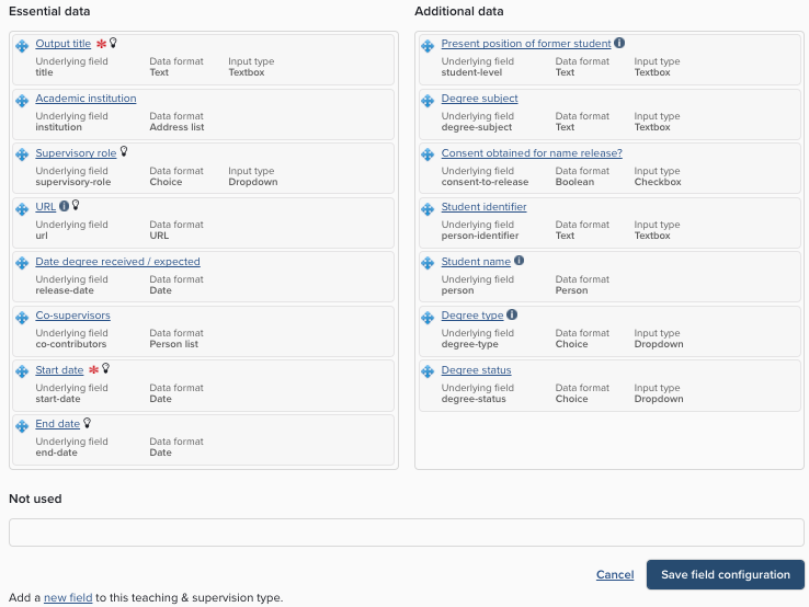 Not used: fields in this box will not appear at all when users are creating or editing an object. The field still exists and can contain data but there is no way to access or change that data through Elements' user interface. The field can still be accessed via Elements' API. Put fields in this box when they are not relevant to the Teaching Activity type in question.