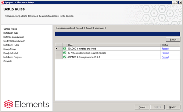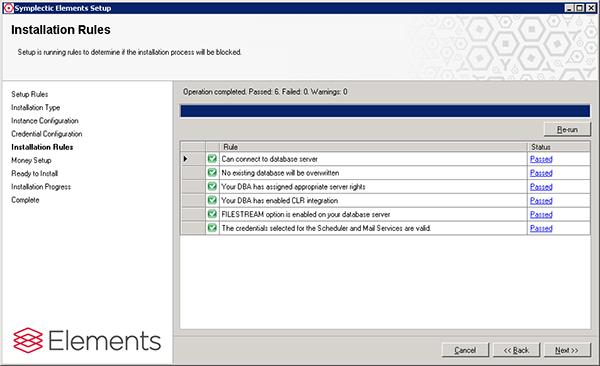 Unzip the installation kit and run the process Setup.exe from within the Setup folder of the Install kit. This will launch the graphical installer at the Setup Rules screen as shown below: