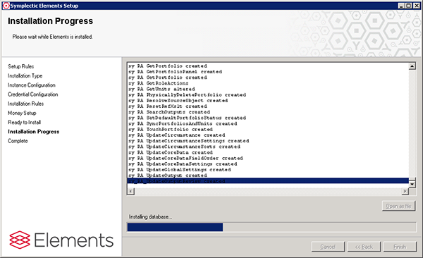 The progress screen will keep you informed as the installation progresses, installing the Elements executables and creating a new database.