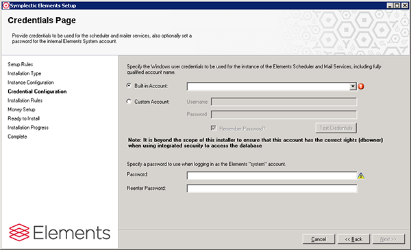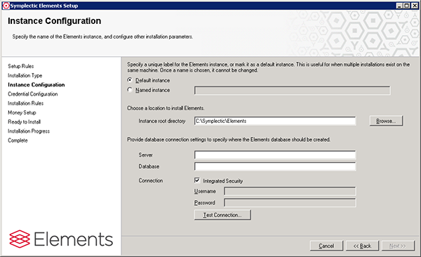 Note: if you specify an SQL account, rather than Integrated Security, Elements will be configured so that all access to the database uses the supplied SA credentials.