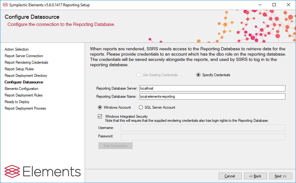 Note: if the Reporting Database is on the same machine as the Elements operational database, then as per the Elements Prerequisites specification, they should be kept on different disks.