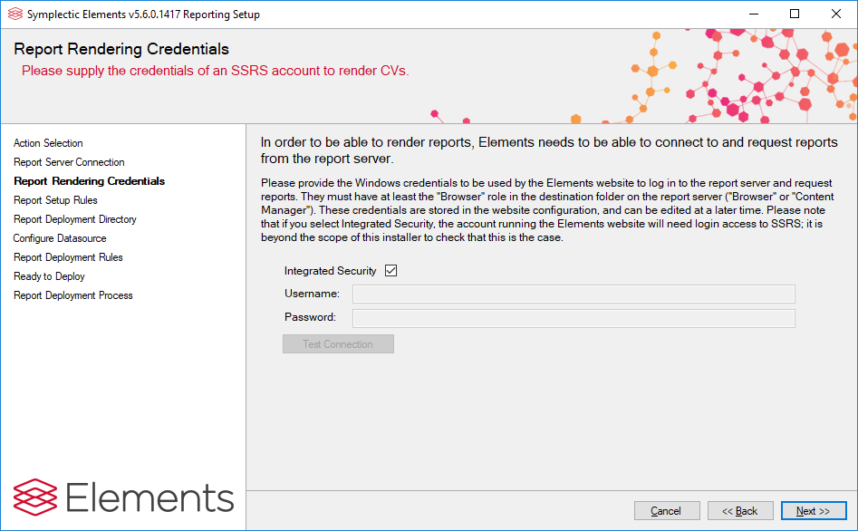 Elements needs to know what credentials to use to connect to SSRS in order to render CVs. The credentials must map to a Windows account on the machine running SSRS that is mapped to roles within SSRS that have suitable rights to render reports. To assign report generation rights to the chosen account:
