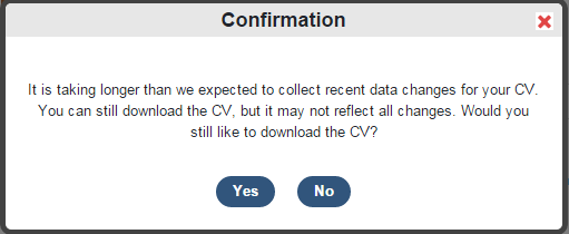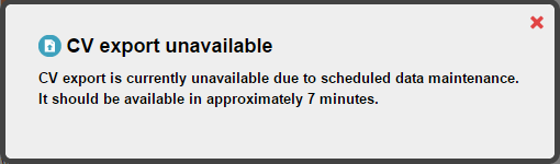 And additionally, if a full reload of the reporting database is underway (a full data synchronisation), then CV export will be temporarily disabled. Clicking the Export button at these times will show the following message: