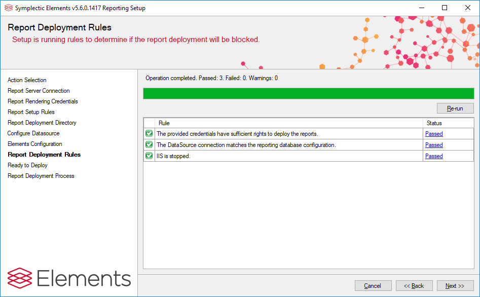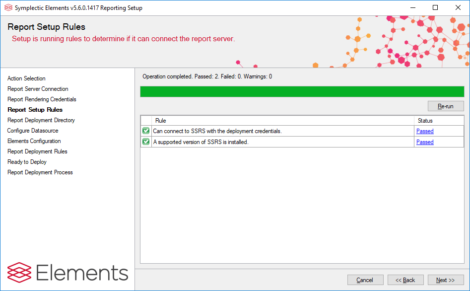 This step checks whether report deployment will be blocked. If any tests fail, you will not be able to continue with the setup process. Warnings will not stop deployment but you should check them so that you are informed about the consequences of continuing.