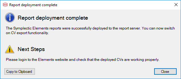If the deployment succeeds, a Report Deployment Complete dialog box will be shown. This will contain information about the deployment, and any necessary further steps to be taken.