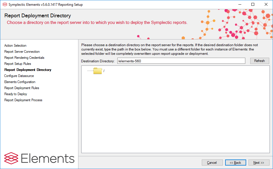 Choose the location of the reports within the SSRS directory structure. A different directory should be used for each Elements instance. An existing folder can be selected by clicking on it within the directory tree, or a new folder can be specified by typing its path in the Destination Directory textbox. On SSRS, directories are separated by the "/" character, and the root folder "/". If there any existing Elements deployments on SSRS (of Elements version 4.12 or later), these will be indicated by the Elements logo.