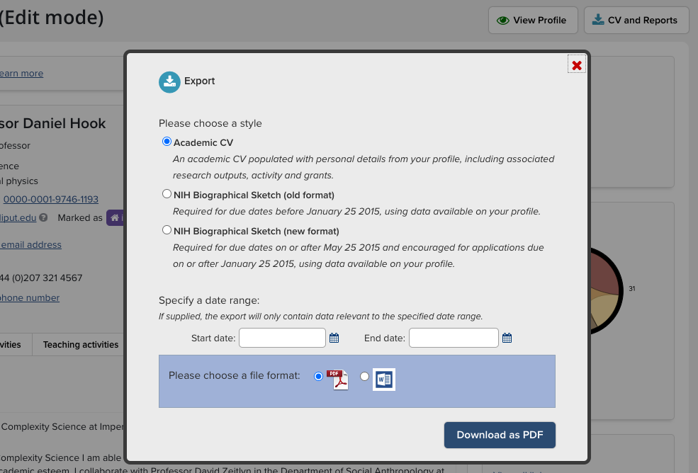 Clicking this button produces the following screen, where you are prompted to choose between an Academic CV or an NIH Biosketch (in two different versions), and select the format of either PDF or Microsoft Word. Note that the Biosketch CVs will only export as a Word document, as it will require further customisation.
