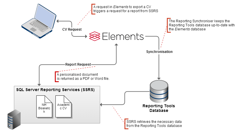CVs in Elements are generated using SQL Server Reporting Services (SSRS/Report Server) and the Elements Reporting Database. When a CV export is requested, Elements contacts SSRS and requests the rendering of a 'report' for a user. The SSRS Report Server then contacts the 'data source' (Reporting Database) to request the information it requires ('datasets') in order to generate the report. It formats this information as laid out in the report and returns it to Elements as a document (.pdf, .docx) which is then downloaded by the user. To ensure that the data is up to date, ongoing synchronisation is required between the Elements operational database and the Reporting Database.