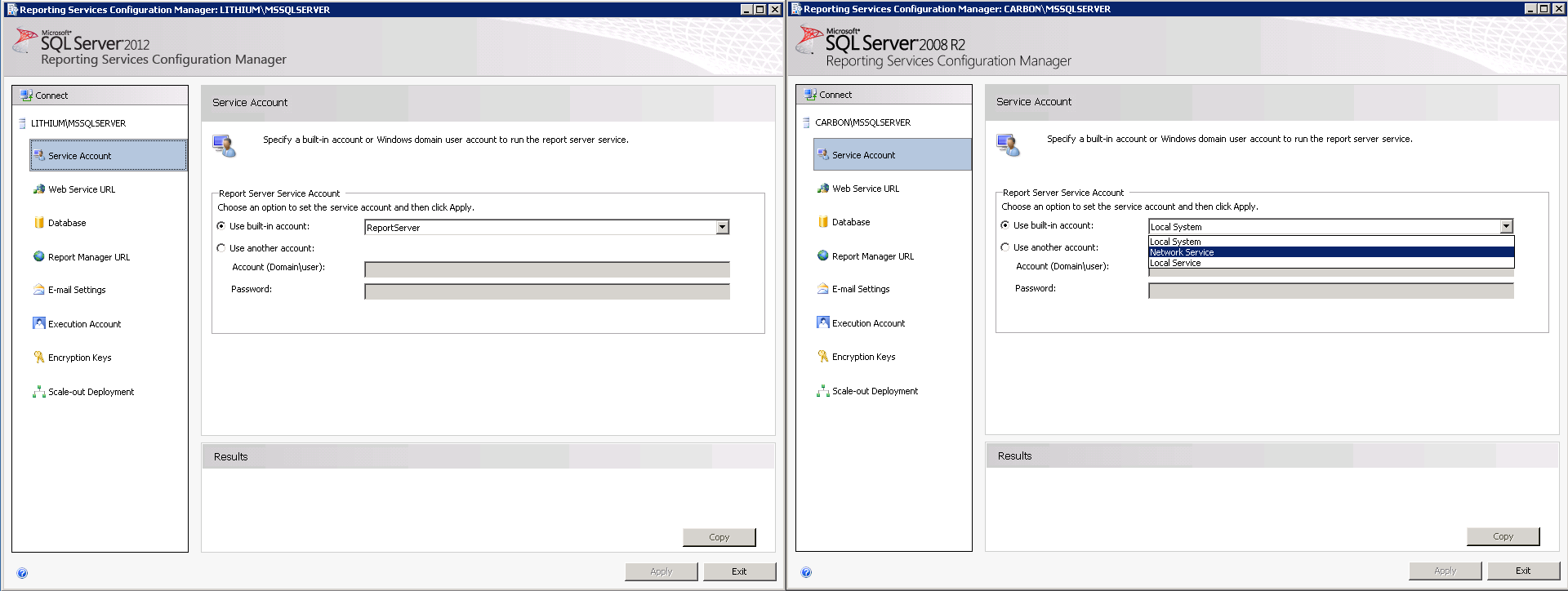 For SQL Server 2012, select the built-in account 'ReportServer'. You can alternatively choose to run SSRS under a different Windows User account.