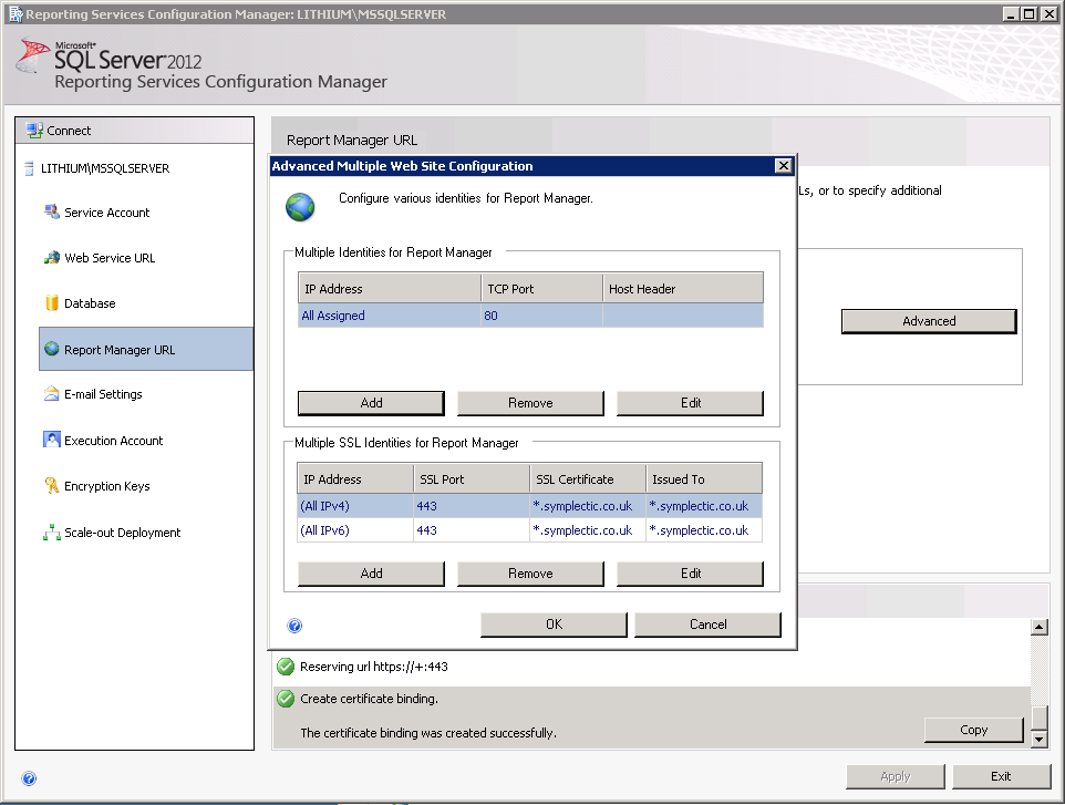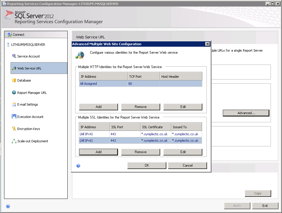 Note about SSL Certificates: The certificate name should match the domain name of the machine. I.e. in the example screenshots '*.symplectic.co.uk' matches the domain name 'lithium.symplectic.co.uk'.