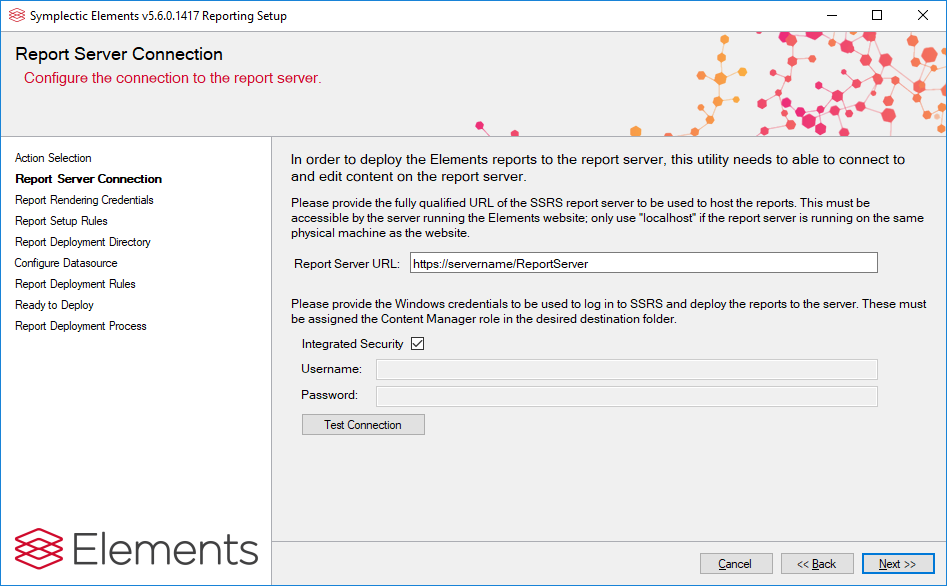 Specify the credentials which the Elements Website will use to log in to SSRS to request the reports. AS before, a domain can optionally be specified. The same account as the Report Server Connection page can be used, but for security reasons it is recommended that the provided account has only the "Browser" role on SSRS. This will mean that the account stored by the Elements Website will be able to read, but not modify, content. Note that Integrated Security here would mean that the account running the Elements Website itself would attempt to log in to SSRS. It is beyond the scope of the setup tool to test whether or not that account has access.