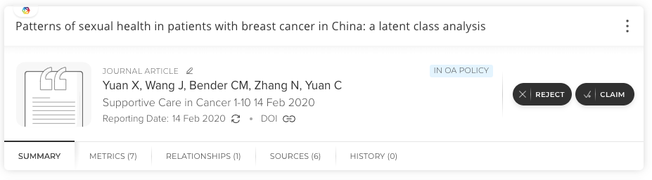 When you select publication types and add a start date in the OA policy settings, you will notice that end users are presented with additional details on the brief summary screen when claiming items. This confirms that the item falls within the OA policy you have set.
