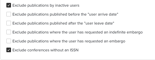 User Leave Date - Exclude publications when users leave your institution. This requires the Leave Date for the user to be populated in the User Feed.