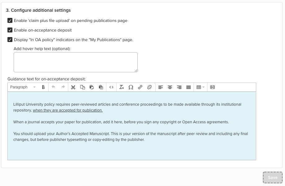 Guidance Text - On acceptance deposit relies on manual data entry by end users, to assist them with this process, edit and format help guidance text. This guidance text appears after selecting the Deposit Accepted Publications link.