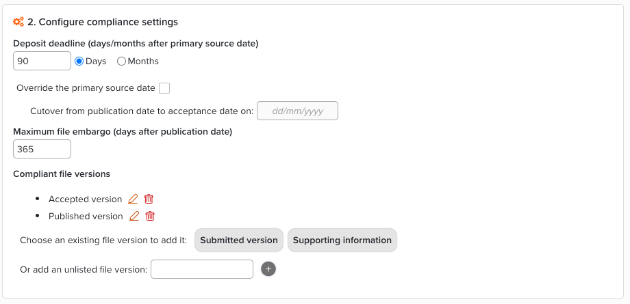 If no file version is set, then file version will not be used to assess compliance. If any versions are specified, then a publication can only be compliant if at least one of the file versions is out of embargo at the end of the specified period.