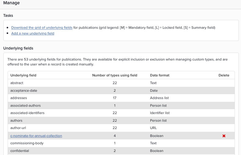 Underlying field types - View the number of publications types using a field and the data format for each field. Some fields are reserved for use by external datasources. More information is available in the Data Migration article. Locally created or custom underlying fields are prefixed c- and can be deleted by clicking the red cross.