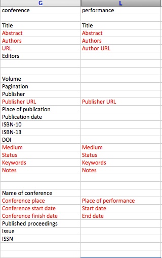 The grid of underlying fields for publications shows which fields in each publication type Elements considers to be equivalent. If you change type from Conference contribution to Performance, Elements will move data between the fields that share underlying type. All other fields will not be populated. If you change your mind and revert back to a Conference contribution, underlying data (in red) is retained and re-populates the fields.