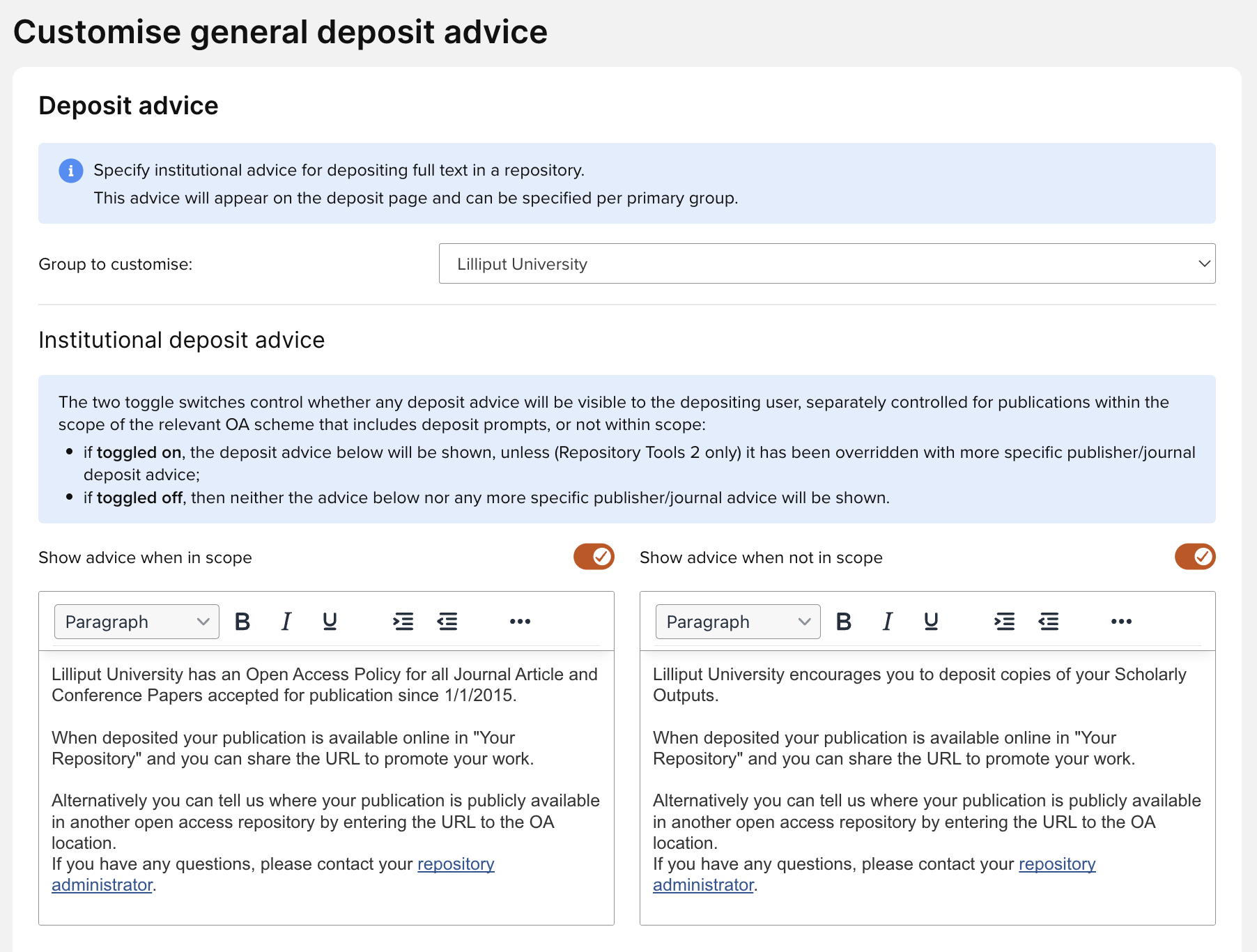 This article outlines how deposit advice can be customised to appear in the repository deposit screens.