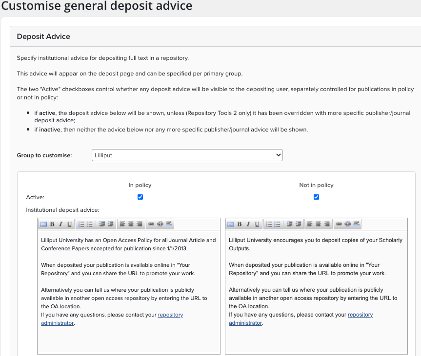 Deposit advice is configured via Open Access > Deposit Advice > General Deposit Advice. The advice configured in the General Deposit Advice section will appear on both the Repository Tools 1 and Repository Tools 2 Deposit pages.