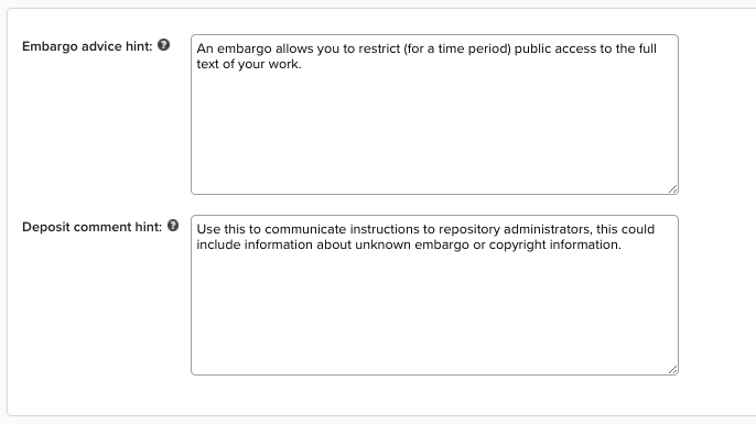 Provide the text to be displayed if you allow users to specify the embargo advice (via Open Access > Repository tools > [selected repository]).