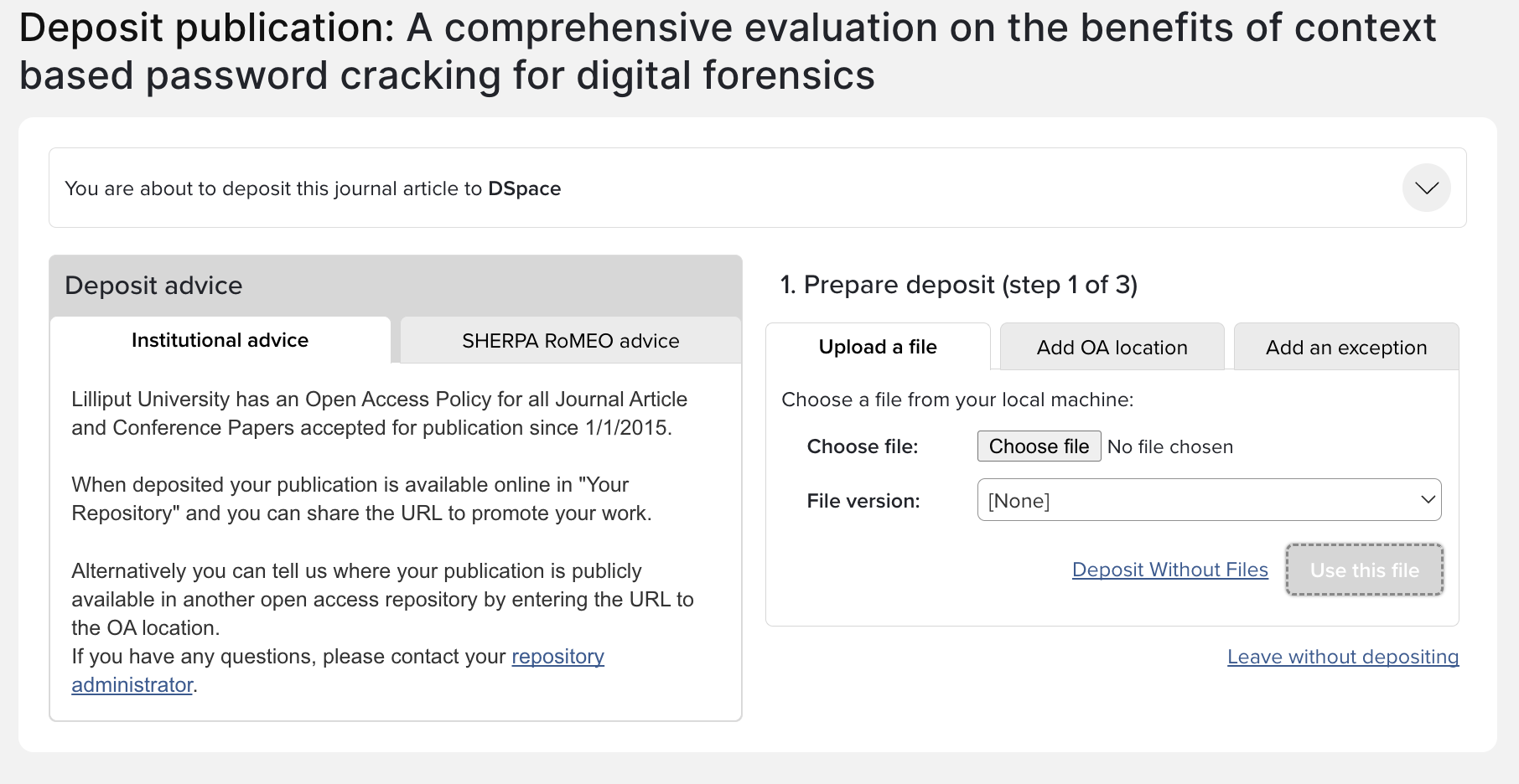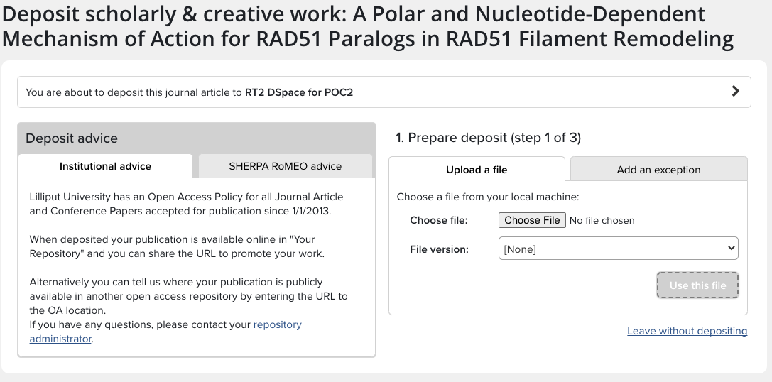 In line with the changes introduced by the new SHERPA RoMEO API, 'Sherpa colours' are no longer used. As a result, the deposit advice page has been simplified. Now the page displays one set of general institutional advice, with a variant for publications which are/are not in policy. If deposit advice is active and SHERPA RoMEO advice is available, it will be displayed in its own tab on the deposit page.
