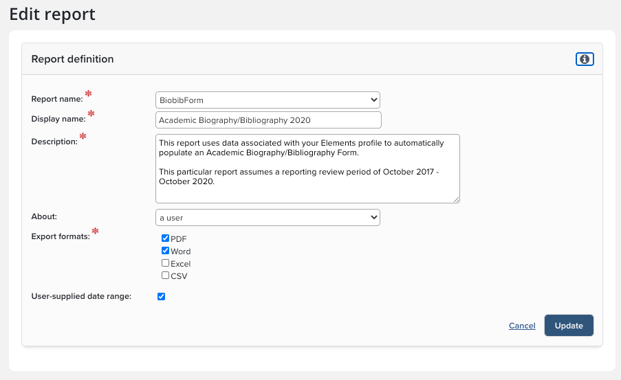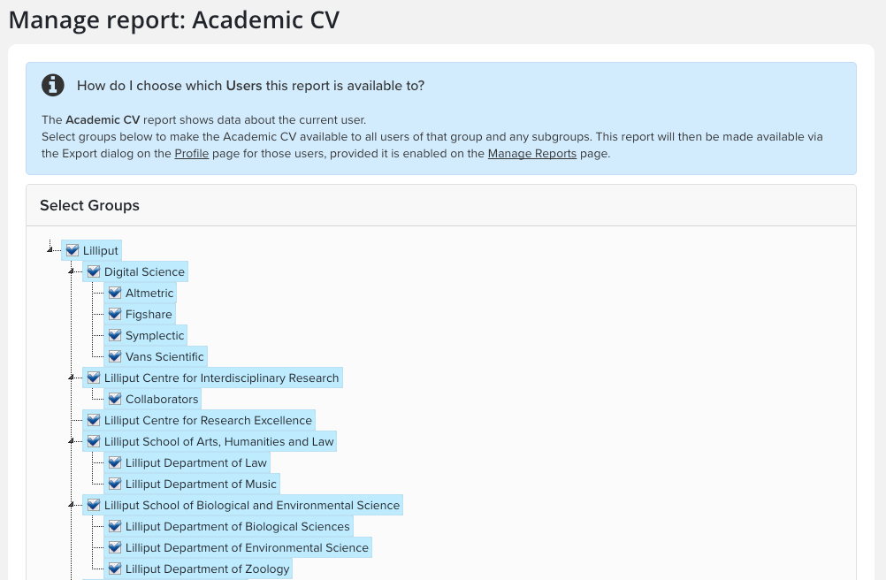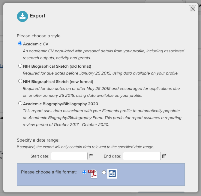 Name: By default, the stock Symplectic reports should be visible (Academic CV, and two formats of the NIH Biosketch).
