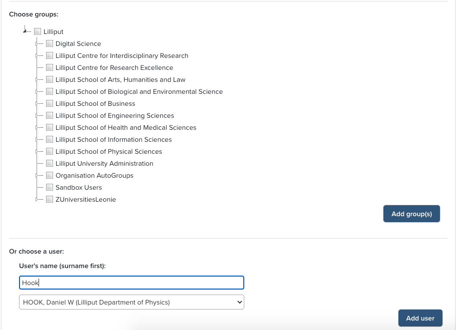 Start by typing the user's name, surname first, into the search box. As you type, suggestions will appear in the dropdown list below the search box. Select the correct user and click the Add user button.