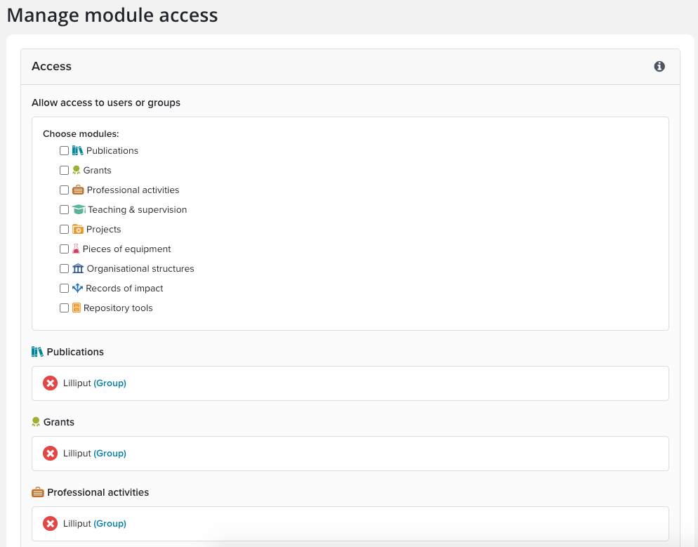 The lower part of the page shows, for each module, the groups and users that are currently allowed to access it. To remove one of these access permission, simply click the red cross next to it.