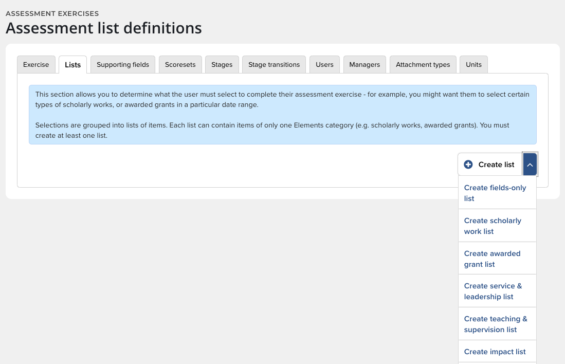 This section allows you to determine what the user must select to complete their assessment exercise. For example, you might want them to select certain types of publications, or grants in a particular date range. Selections are grouped into lists of items. Each list can contain items of only one Elements category (e.g. publications, grants). You must create at least one list.